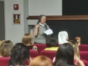 L’ispetttrice sr Gabriella Garofoli, nel suo saluto, ha richiamato la necessità di vivere il Sistema Preventivo non solo nei momenti formali, ma anche negli incontri quotidiani con i ragazzi, ricordando le parole di Don Bosco: “Non basta amare i giovani, ma è necessario che si sentano amati”.